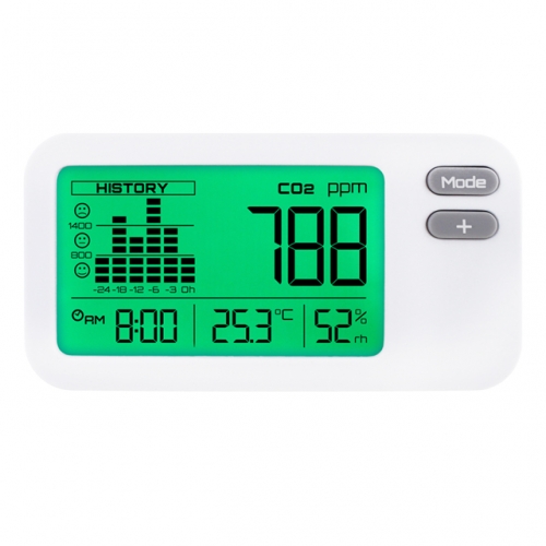 ZyAura ZGm27,迷你三合一二氧化碳監測儀,採用專業的NDIR技術和大液晶顯示,長達24小時記錄室內空氣品質和二氧化碳狀態呈現。ZGm27採用自動調整LCD背光設計,節省電量和延長電池壽命,以長期監測空氣質量,可廣泛用於辦公室、學校、購物中心和 HVAC 空調系統等建築物內的空氣質量檢測。