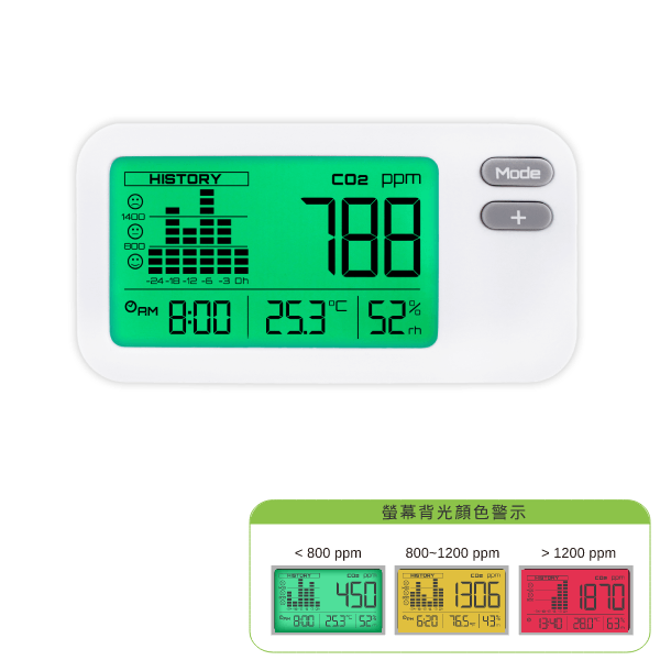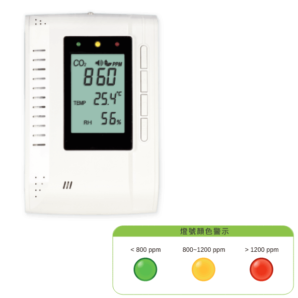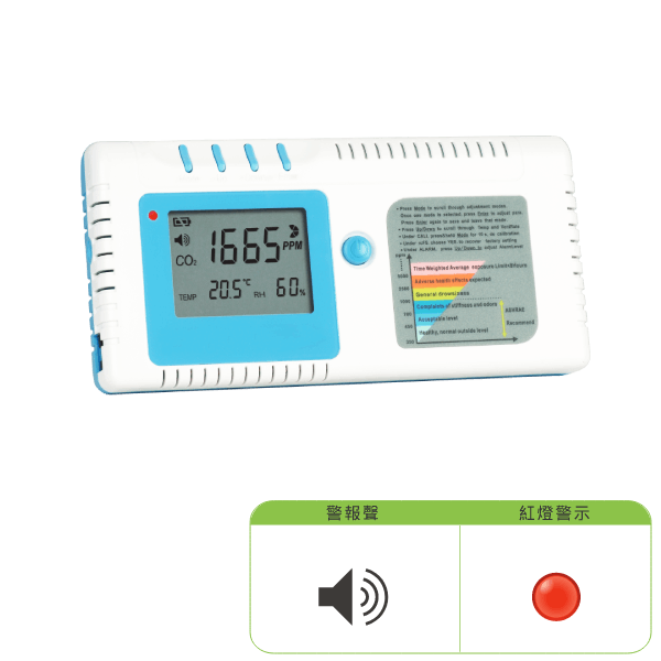 二氧化碳偵測儀即時監控室內二氧化碳濃度,一旦二氧化碳濃度瞬間急遽上升時,室內環境可能產生異常氣體或高耗氧現象(如室內汙染物驟增、烹飪或取暖不慎、物體燃燒…..等),作為危機反應之前哨站。