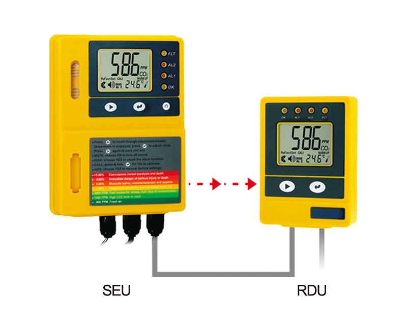 ZyAura Wall Mount CO2 Monitor ZG10U is used for CO2 detection up to 50,000 ppm and temperature for indoor air quality. The CO2 meter also can control the related instruments easily, including the Sensor Unit (SEU) and Remote Display Unite (RDU) up to 3 connections, which is 7 meters long to extend your measure spot away from the display. The ZG10U relay output could control the other connected devices, such as CO2 generator or ventilation fan for the HVAC, and lightening industry to ensure the safety of storage areas.