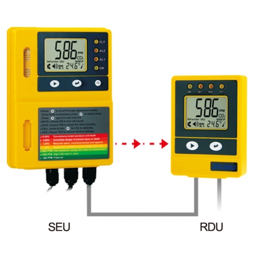 ZyAura Wall Mount CO2 Monitor ZG10U is used for CO2 detection up to 50,000 ppm and temperature for indoor air quality. The CO2 meter also can control the related instruments easily, including the Sensor Unit (SEU) and Remote Display Unite (RDU) up to 3 connections, which is 7 meters long to extend your measure spot away from the display. The ZG10U relay output could control the other connected devices, such as CO2 generator or ventilation fan for the HVAC, and lightening industry to ensure the safety of storage areas.